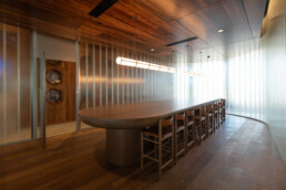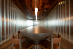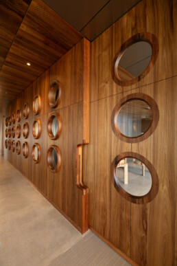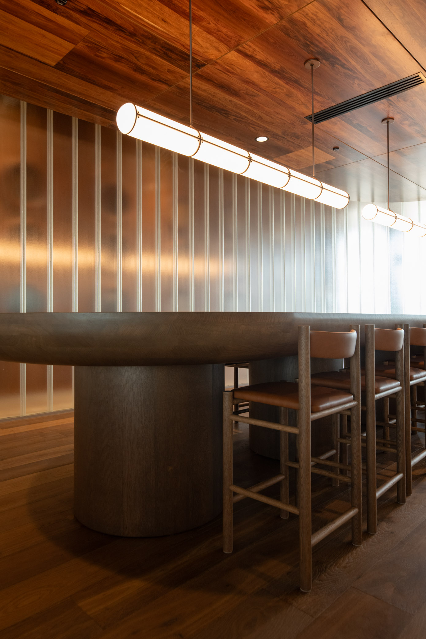 - Rich, Warm Aesthetics: Tasmanian Blackwood is prized for its deep, warm colouring—ranging from golden brown to dark reddish-brown—and its distinctive, often wavy grain. This rich character was utilised in both solid timber and veneer form to provide continuity and a classic, welcoming ambiance across the main communal areas, including the bars and the tasting room.