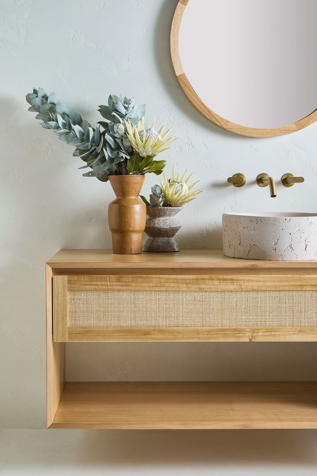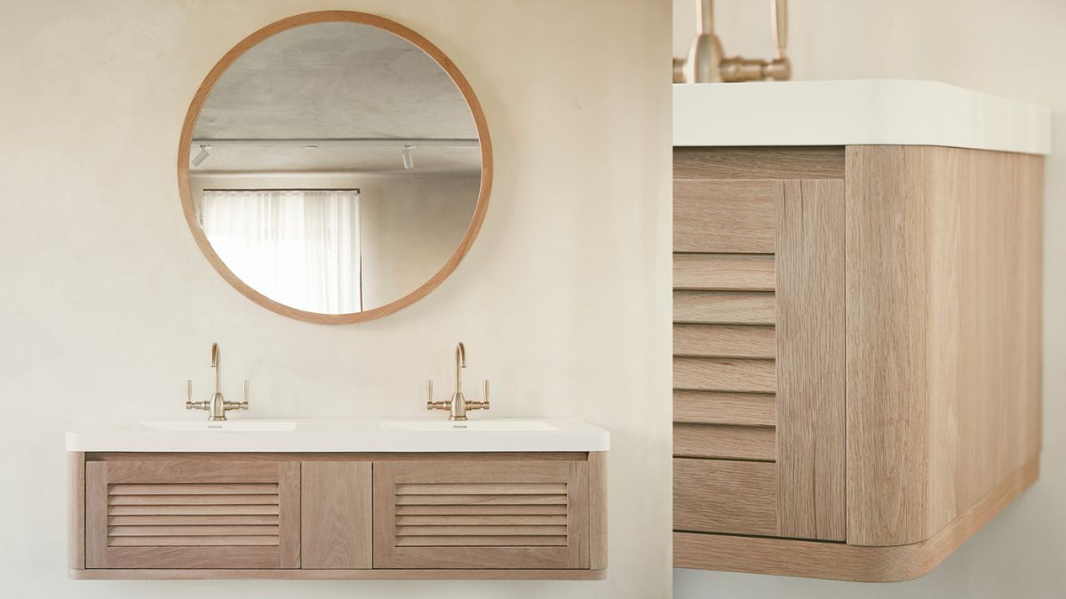 - The Perfect Pairing: When paired with the Alura Round Mirror, the clean lines and light tone of the Tasmanian Oak cabinetry provide a grounded, natural element that elevates the entire bathroom space.