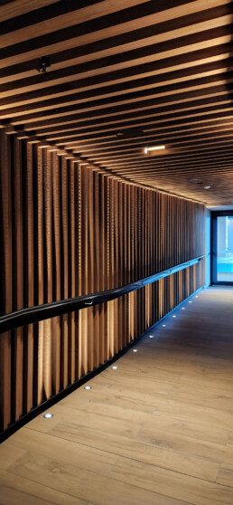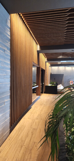 - Solar Regulation and Lightweight Design: The screens serve a vital functional role, acting as operable bi-folding elements to regulate solar heat gain on the west-facing facade. Abodo’s lightweight nature, compared to dense hardwoods, proved ideal for these large, moving elements, facilitating smooth operation and reducing load on the building structure.